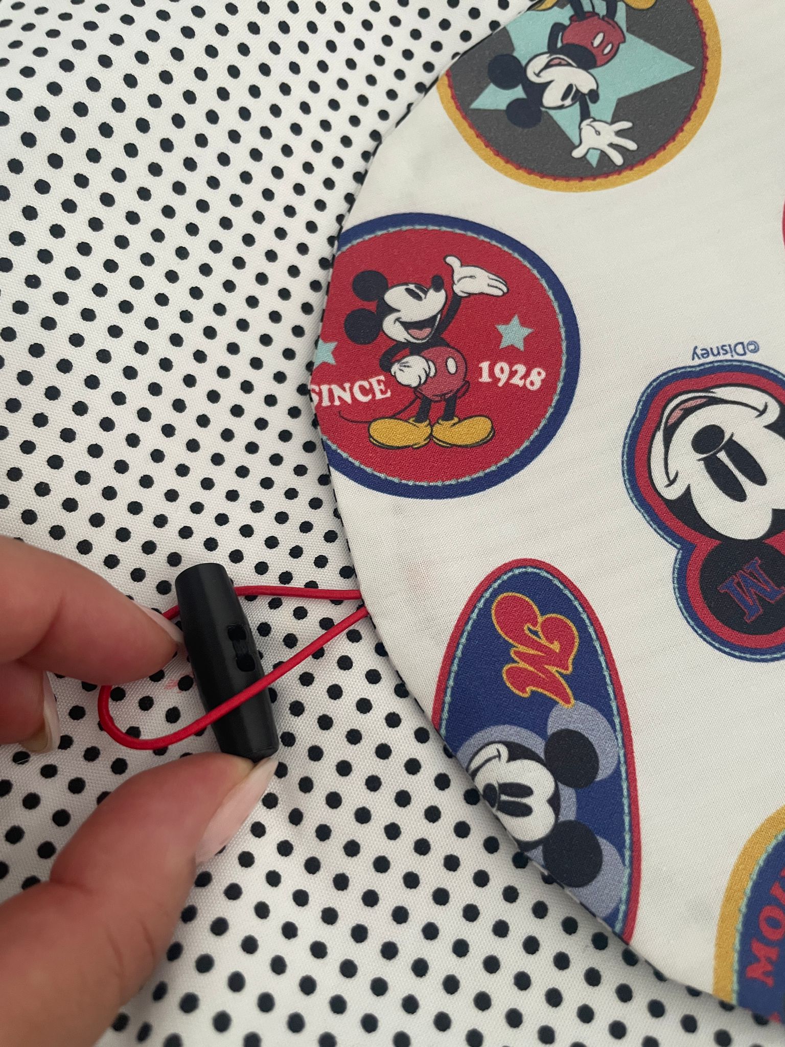 Cierre superior con clip de plástico, goma elástica y botón plano fabricado en impresora 3D con PLA, un material biodegradable, aportando un toque sostenible e innovador.