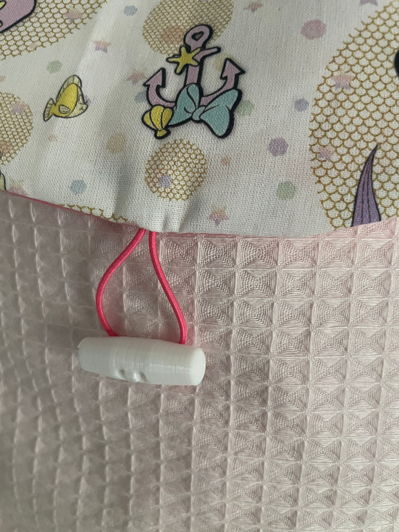 • Cierre superior con clip de plástico, goma elástica y botón plano fabricado en impresora 3D con PLA, un material biodegradable, aportando un toque sostenible e innovador.