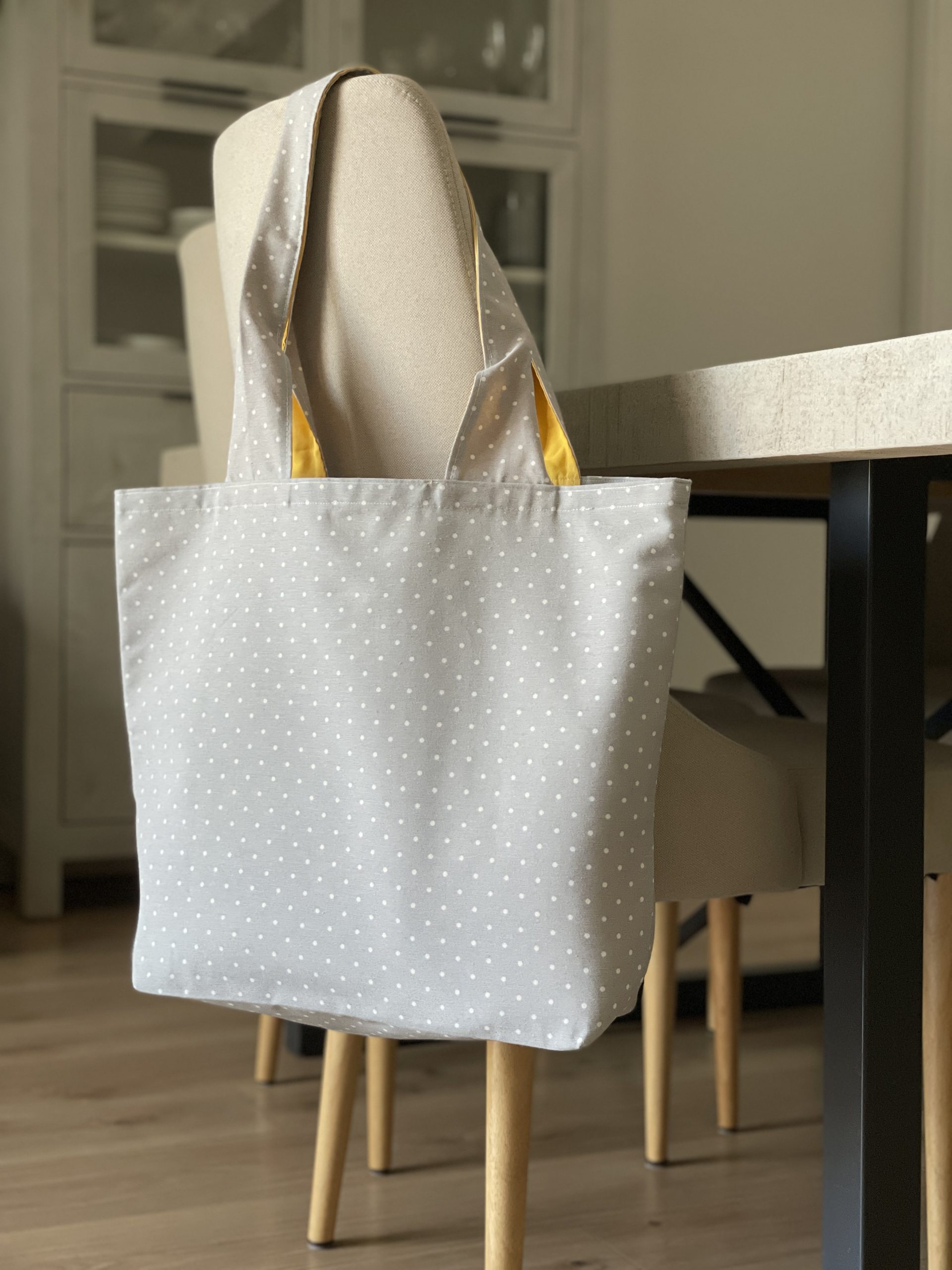 Luce estilo y practicidad en cada salida con esta tote bag shopper confeccionada a mano. Tela loneta de topos  con asa reforzada y combinada con tela de algodón. Hecha con materiales resistentes y cuidando cada puntada, es la compañera ideal para tus días más ajetreados. Nota: El color puede variar por la calibración de las pantallas. Personalización: Una incial, si necesitas más consulta precio.